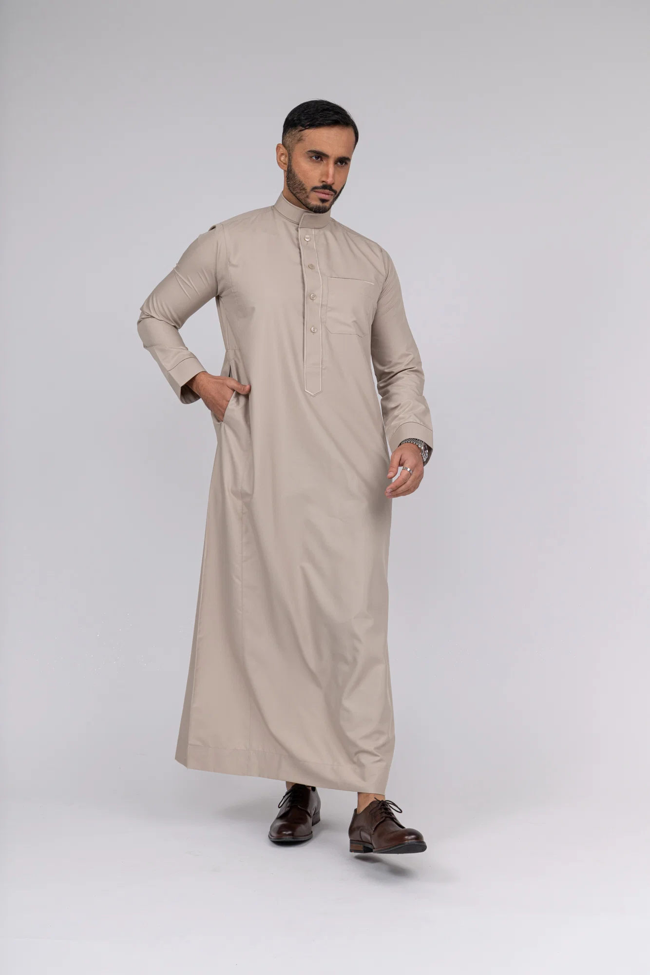 This beautifully made embroidery Aseel Jubba / Thobe is from the new high-quality premium range. The thobe comes in a beige summer fabric with embroidery.Ā
