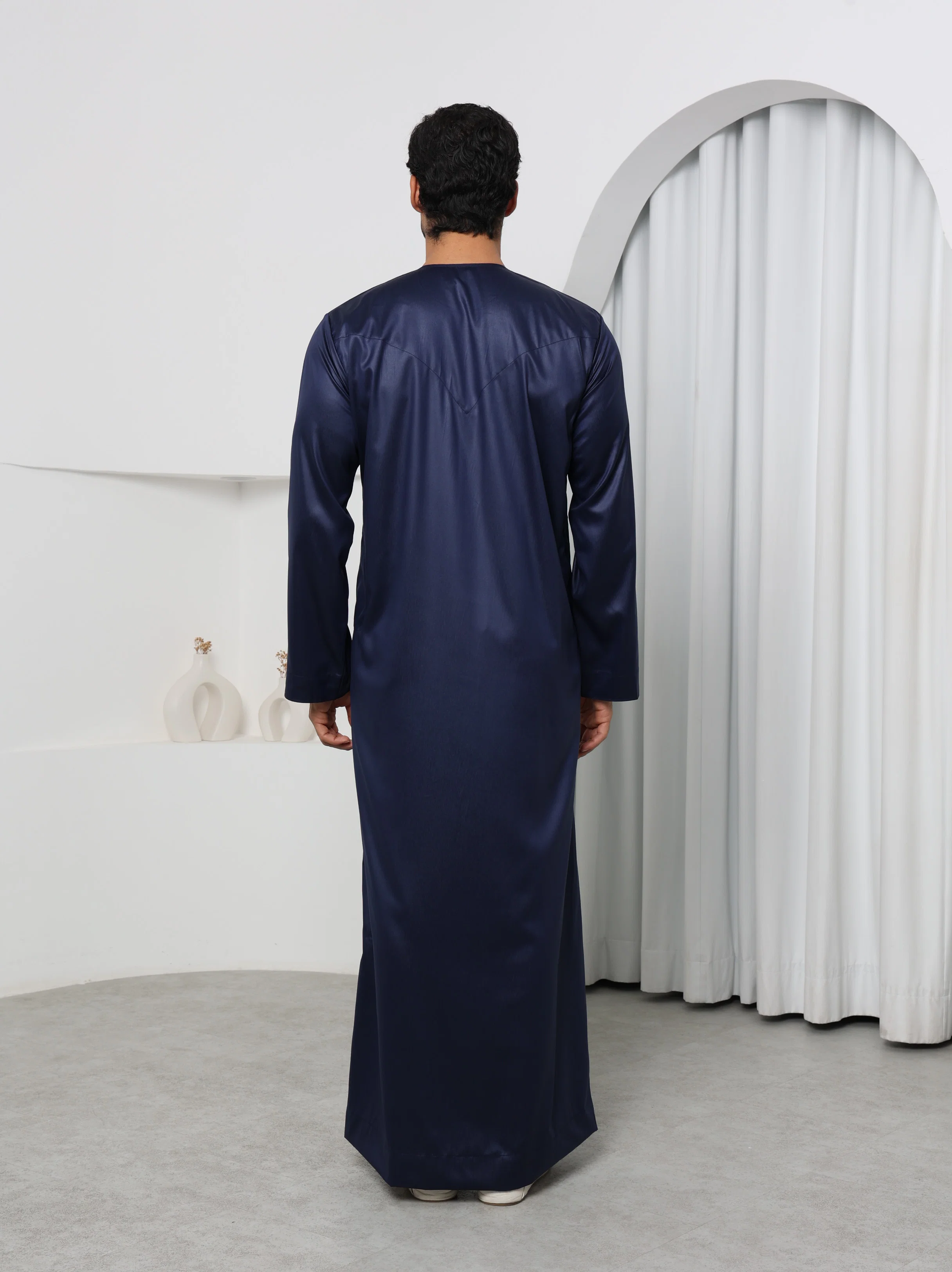 This navy Emirati thobe is crafted from a luxurious silk-feel fabric and proudly made in the UAE. It features a removable tassle and a stylish, hidden zip. Enjoy a wardrobe classic with an exclusive, cultural twist.Â