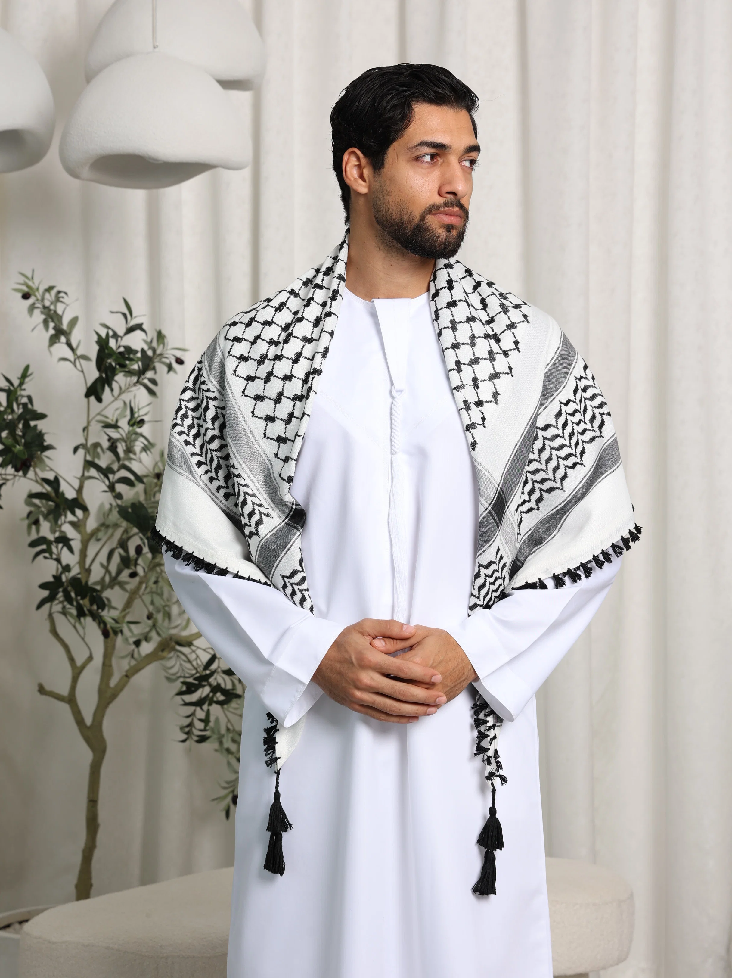 Our Authentic Palestinian Keffiyeh is crafted from premium polyester, offering comfort, and durability. Featuring the classic white base with striking black embroidery and traditional tassel edges, this keffiyeh embodies cultural heritage and authentic Palestinian craftsmanship.