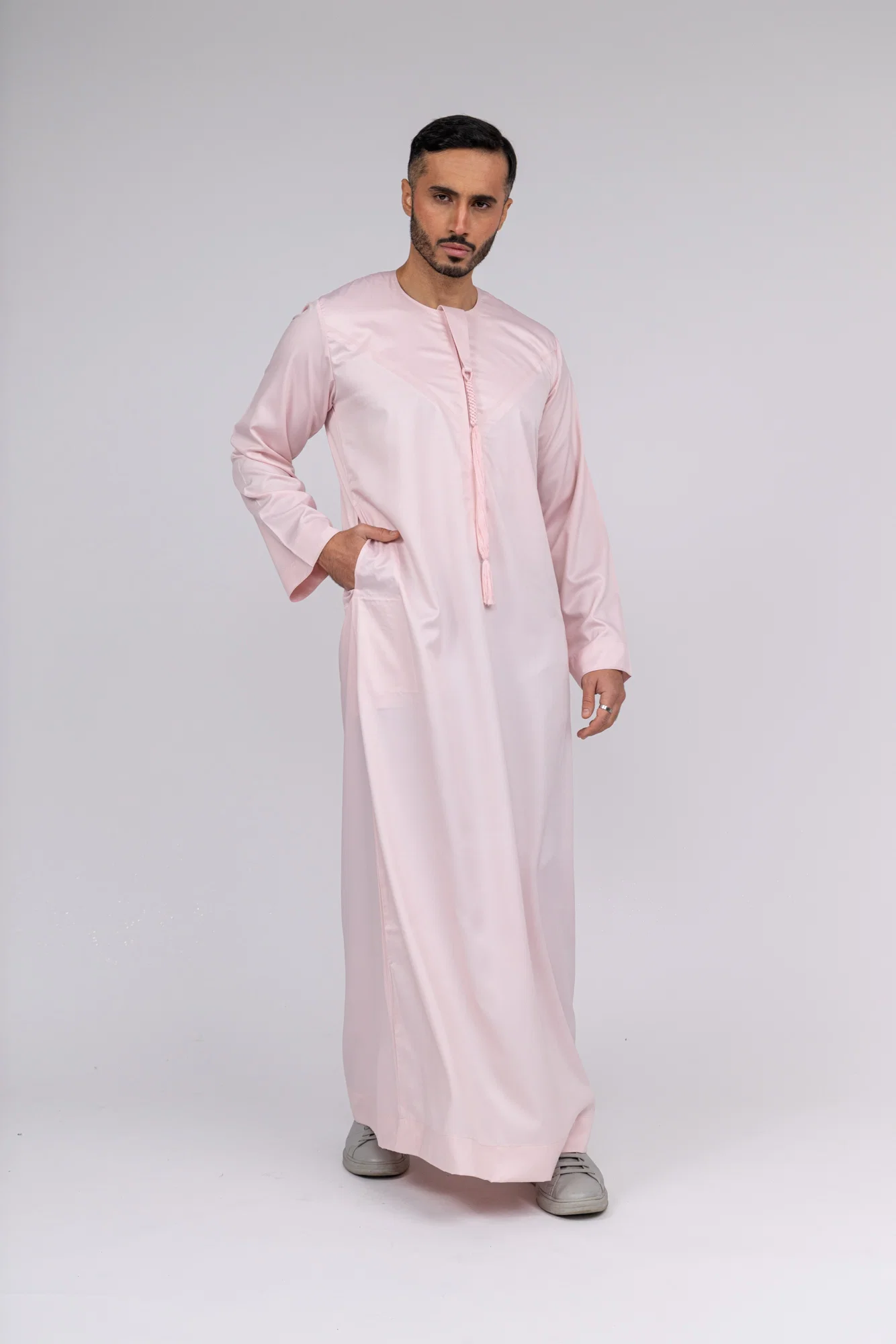 This Blush Pink Emirati thobe is crafted from a luxurious silk-feel fabric and proudly made in the UAE. It features a removable tassel and a stylish, hidden zip.