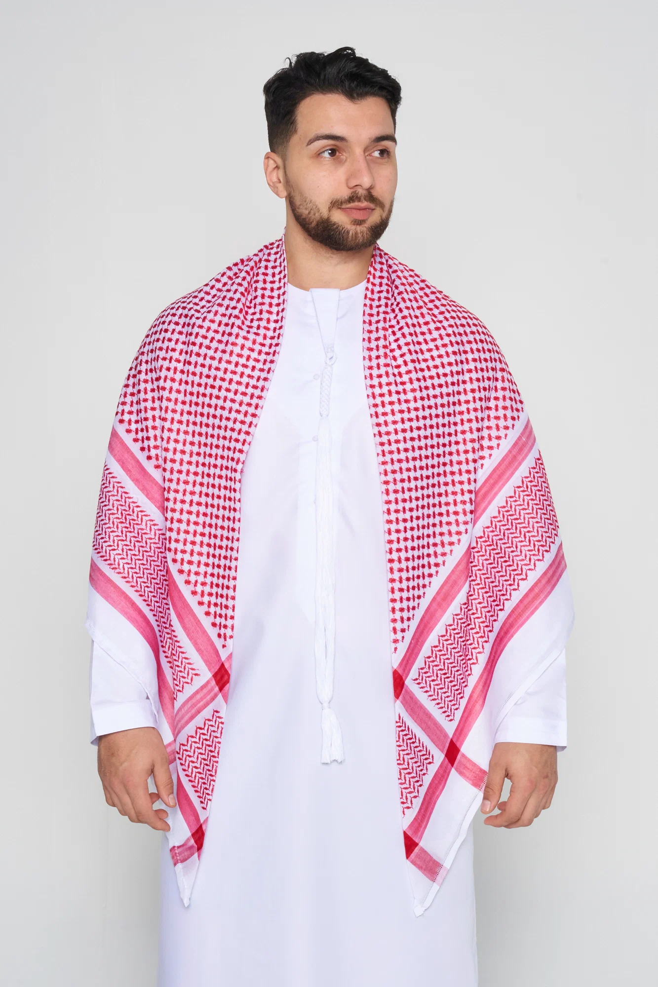 This shemagh is unique in that it combines a unique shemagh imprint with a perfectly embroidered, bright red/white colour and matched edges.