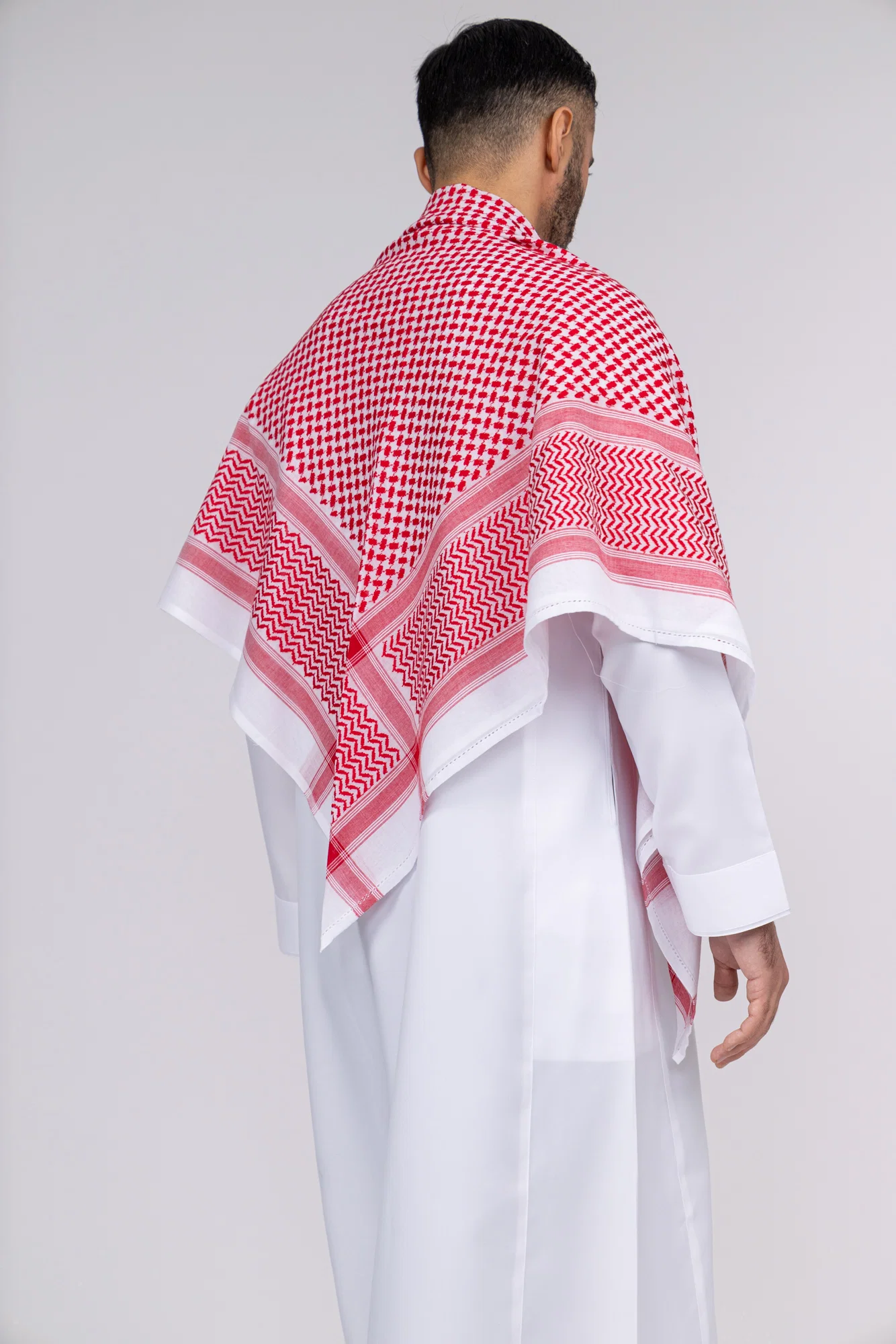 Our Red Saudi-Style Shemagh with White Embroidery is crafted from 100% premium cotton, offering breathability, comfort, and a crisp, classic feel. Designed in authentic Saudi style, the vibrant red fabric is accented with elegant white embroidery along the edges, creating a timeless, standout look.