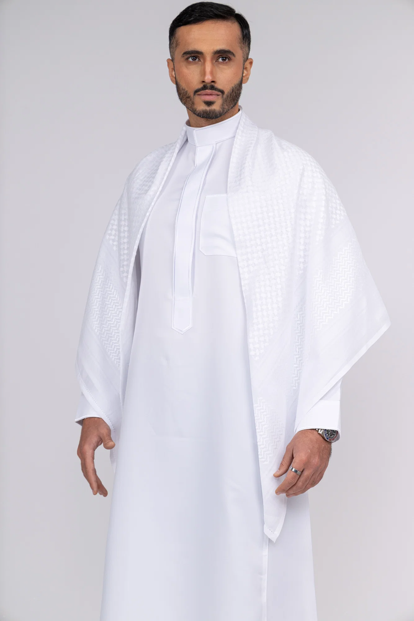 Our White Shemagh with White Embroidery is crafted from 100% premium cotton, offering exceptional comfort, breathability, and a crisp refined look. Designed in a classic Arab style, the subtle white embroidered trim adds an elegant touch while maintaining a clean, traditional appearance.